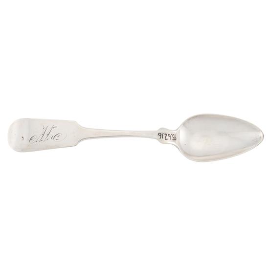 Teaspoon with rounded, downturned, back tipt fiddle handle, rounded shoulders, egg-shaped bowl, and worn bowl-back shell. Inscription: Engraved on handle obverse in script: Mac. Mark: On handle reverse in rectangle: HENRY EVANS / [lion passant] / D / [profile male head].
