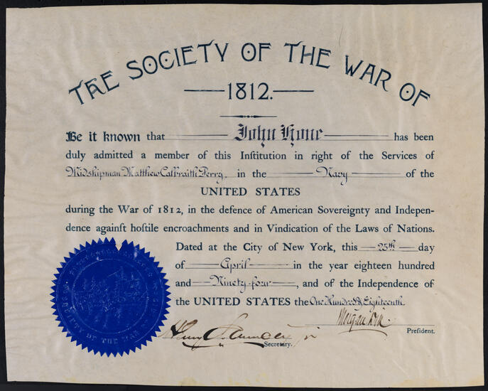 [Certificate of membership to the New York Society of the Order of the Founders and Patriots of America.]