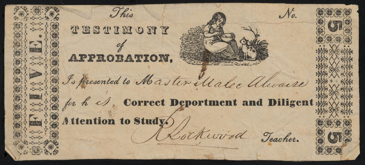 [Testimonial to punctuality, deportment and diligent attention to study.]