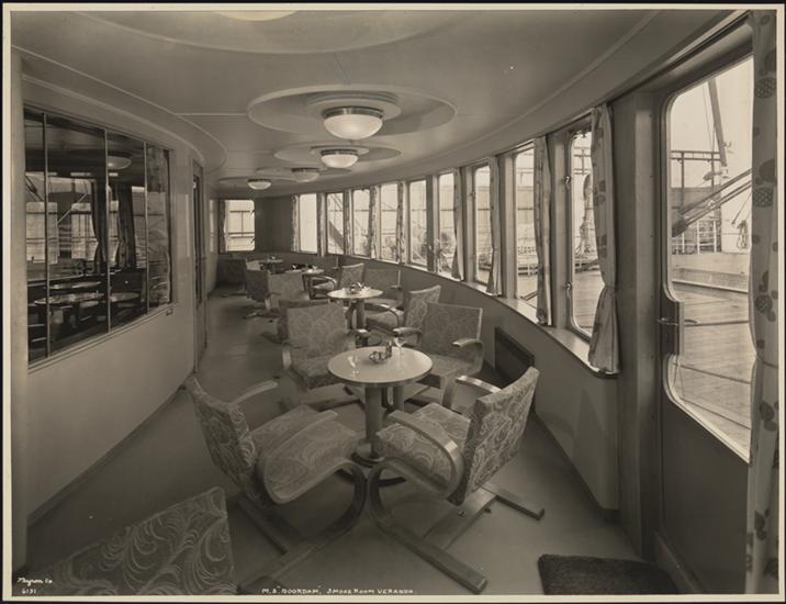 M.S. "Noordam" Foot of 5th St., Hoboken, N.J., One Class, "Tourist" Interior, Promenade Deck, Glass Enclosed.