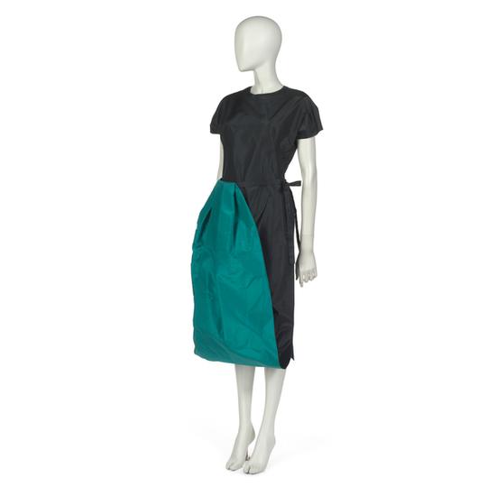 Evening ensemble in crimson, emerald green, violet, and coral red silk poult-de-soie, comprising blouse and skirt