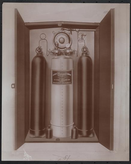 Painting of three tanks in a cabinet, with meters and tubes; center tank has Atlantic Blaugas Co. logo with a main office address in Manhattan, and a factory address in Long Island City.