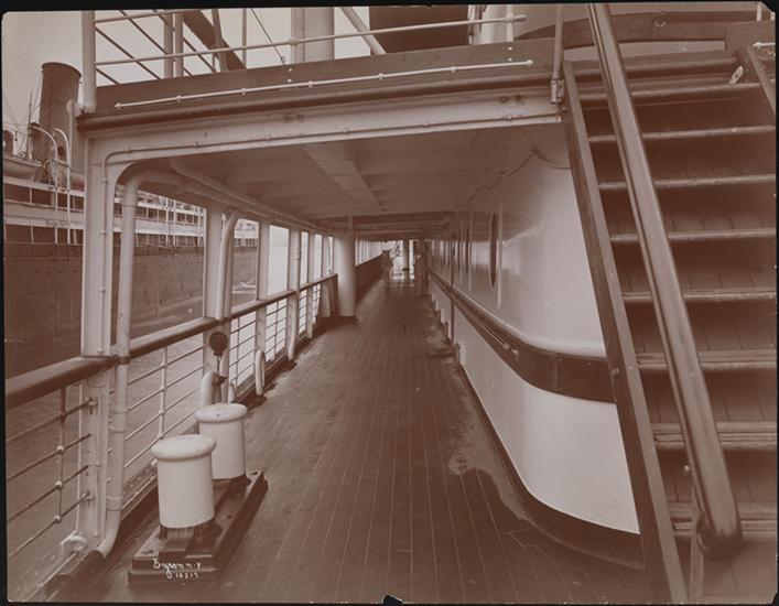 A promenade deck aboard the S.S. "Prinzessin Victoria Luise" at dock.