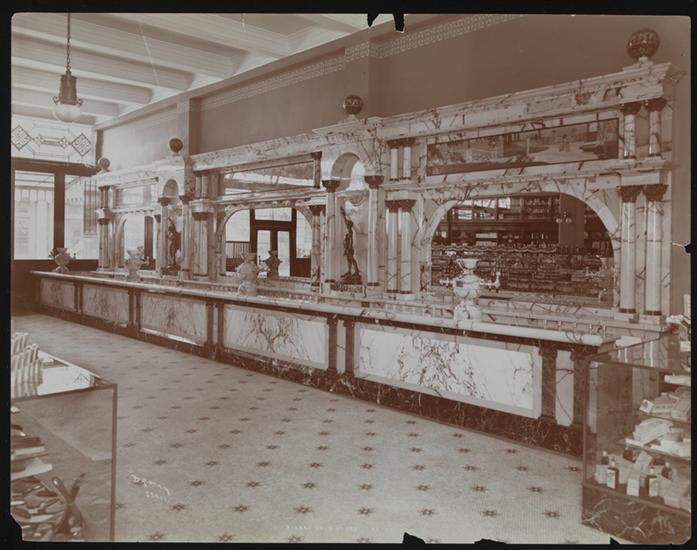Westchester Avenue at the corner of Simpson Street. Riker's Drug Store interior.
