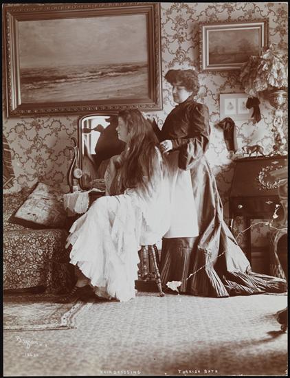 Description A woman brushing another's hair at a vanity in a Turkish bath.