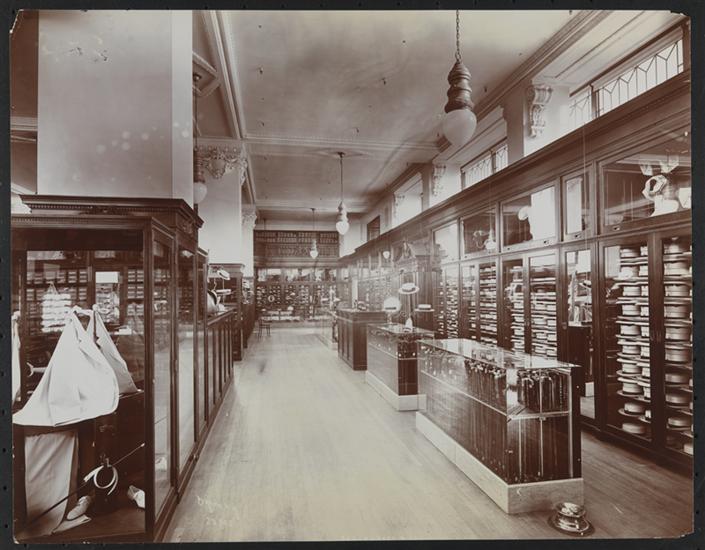 Showroom with wooden and glass cases filled with hats and umbrellas and a spittoon.