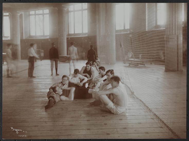 Young men resting in the baseball practice net in the gym at Columbia University.