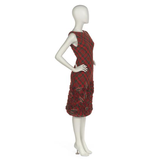 Red cocktail dress of wool broadcloth, striated chiffon and velvet
