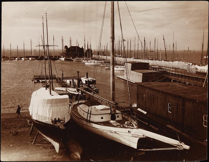The yacht "Valkyrie" (?) docked at a pier in New York Harbor. The Statue of Liberty is visible in the background.