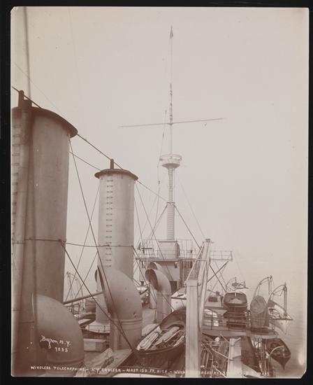Inscription / technical details "Wireless Telegraphing--N.Y. Cruiser--Mast 150 Ft. High--Where messages are sent to B.S. Mass." on neg.
