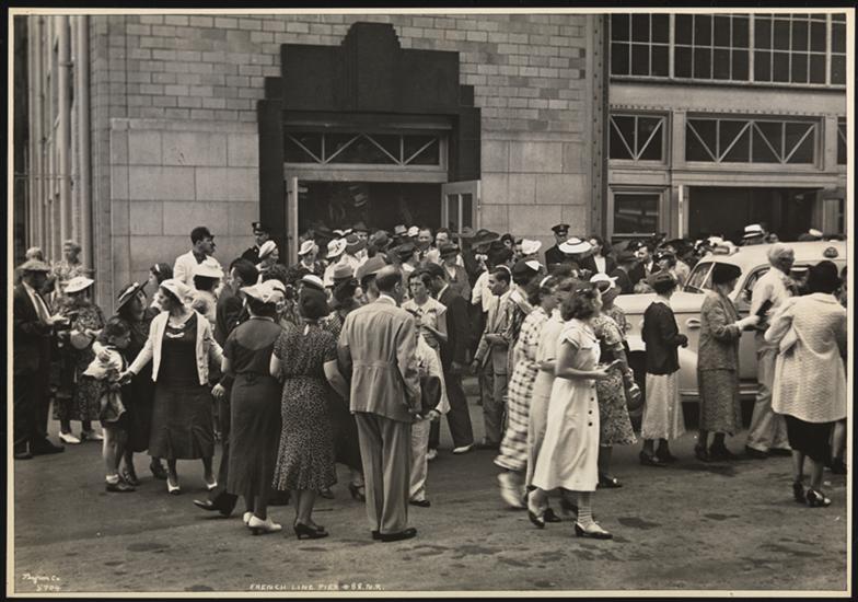 French Line, 610 Fifth Ave., Scenes at Pier #88 N.R., Pier 88 Scenes, Crowds Outside Pier After "Normandie" Sailing.