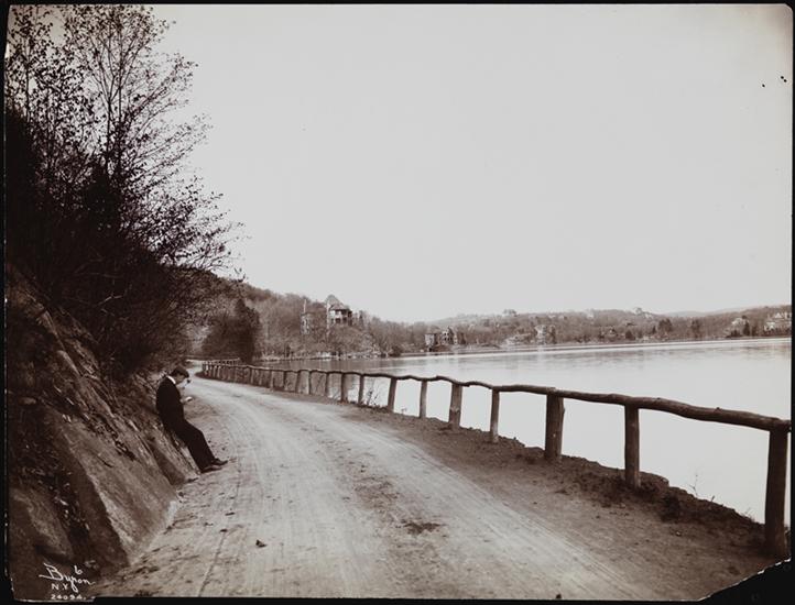A man standing on a dirt road along Tuxedo Lake, Tuxedo Park, N.Y.