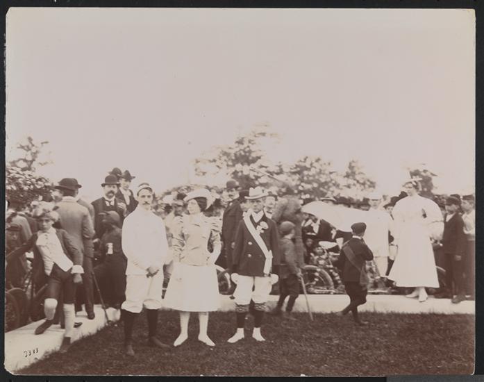 Cyclists and spectators standing near Grant's Tomb at the Evening Telegram Cycle Parade on Riverside Drive.