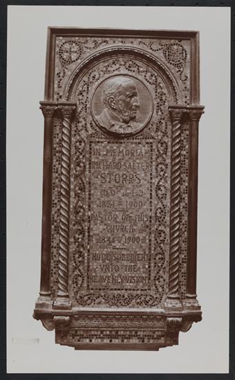 Close-up of a memorial tablet to Richard Salter Storrs, pastor of the Church of the Pilgrims from 1846-1900.