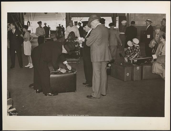 French Line, 610 Fifth Ave., "Normandie" Leaving Pier #88 N.R., Pier Scenes, Custom Inspection of Baggage.