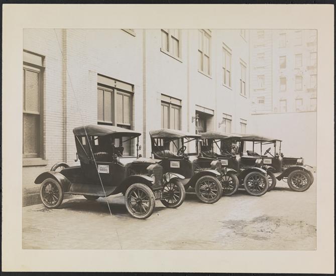 "Fleet of 4 1916-1917 Ford Model T Salesman's Cars with 1917 New Jersey plates, Signs read: Peter Doelger/Healthful/Beverage/Non-Intoxicant" pencilled on verso. | Signed "Byron Co. N.Y." on neg.
