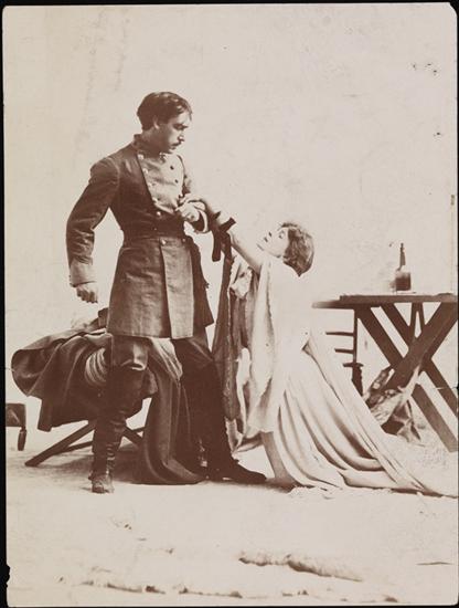 A scene from David Belasco's "The Heart of Maryland," featuring Vincent Serrano as an unidentified character and Mrs. Leslie Carter as Maryland Calvert.