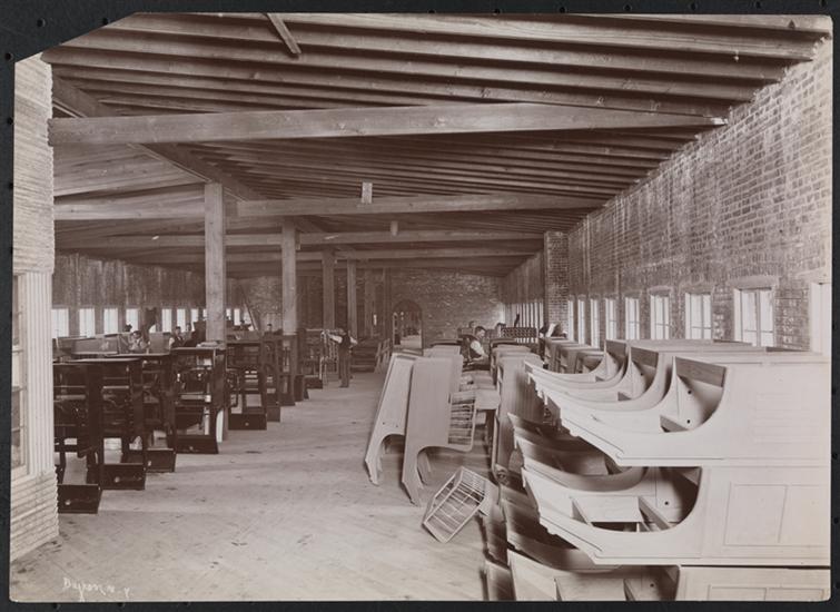 Description Automoblie factory at Kingsland Point, Hudson River (near Tarrytown, NY) with rows of automobile body parts and laborers visible.