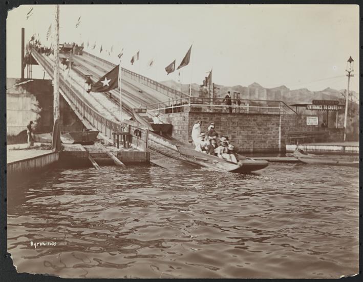 Description Descent of a boat ride filled with passengers, down an inclined chute into a body of water at Coney Island.
