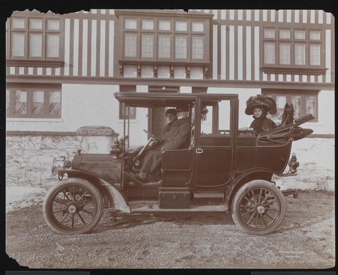 Portrait of Mrs. Hellen Terry Potter and her dog in the back seat of a car with two men in front, parked in front of her house in New Rochelle, N.Y.