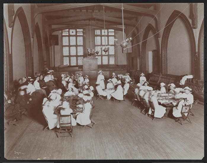 Young girls in uniform sitting at tables practicing domestic chores in a room at St. Thomas' Chapel (Protestant Episcopal) at 230 East 60th Street with adult women supervising.