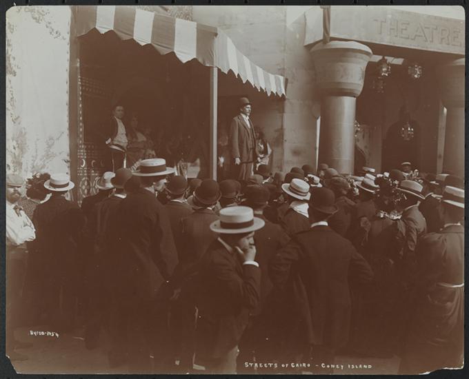 Description Crowd watching a barker at the "Streets of Cairo" show at Coney Island.
