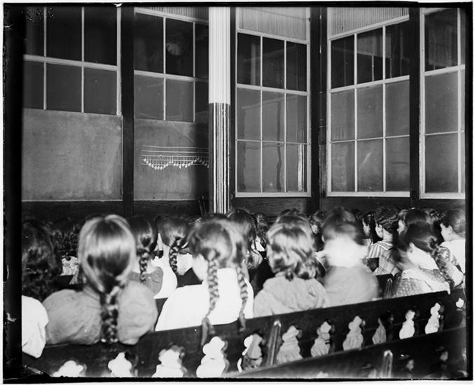 East Side Public Schools 1. A class in the condemned Essex Market School, Gas burning by day.
