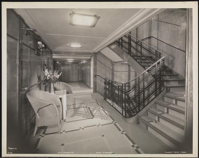 French Line, M.S. "Lafayette" Tourist Class, Interior, Main Staircase.