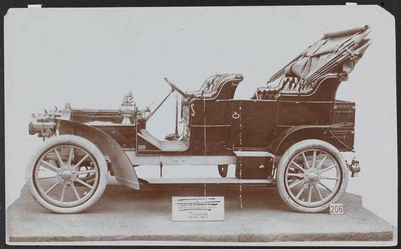 1905 Martini automobile, with a crossed out sign at the base reading "Geissberger/Zurich" and numbered "206".
