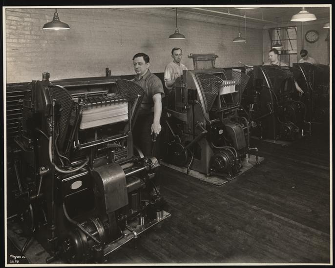 Unz & Co., Printers and Stationers, Fourth Floor, Pressman Working on Miehle Press.