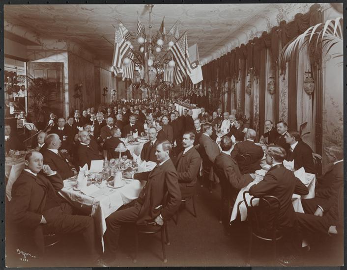 Men seated at tables in a banquet room at the Douglas Lacey & Co. dinner with flags hanging from chandelier.