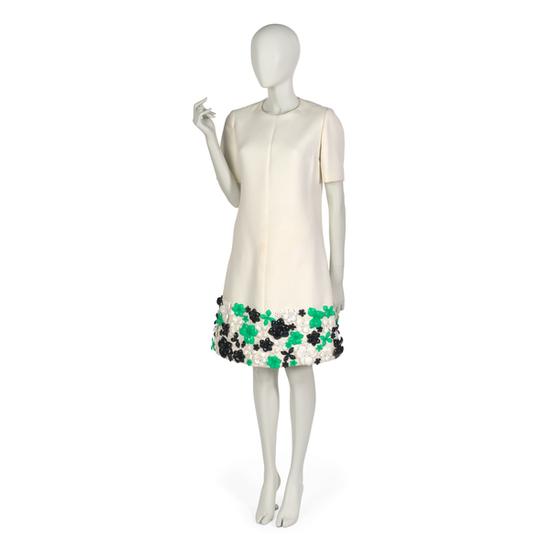 Dinner dress in off-white silk twill with floral embroidery of silk thread, sequins, beads and piping