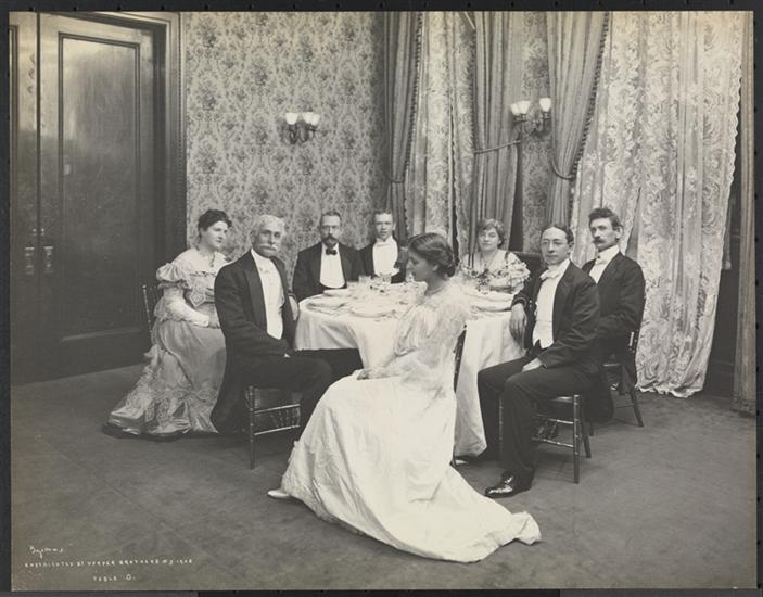 Group posed at a table at the dinner given to Mark Twain in honor of his 70th birthday at Delmonico's. This group is "Table O," including Elizabeth Jordan, Will N. Harben, Brander Matthews, James B. Connolly, Mildred Howells, Isobel Strong, Tom Masson and Peter Newell.