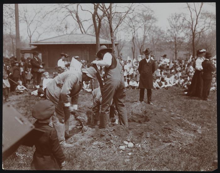Inscription / technical details "Arbor Day, Thompson Sq." on neg--partly cropped, should be "Tompkins"