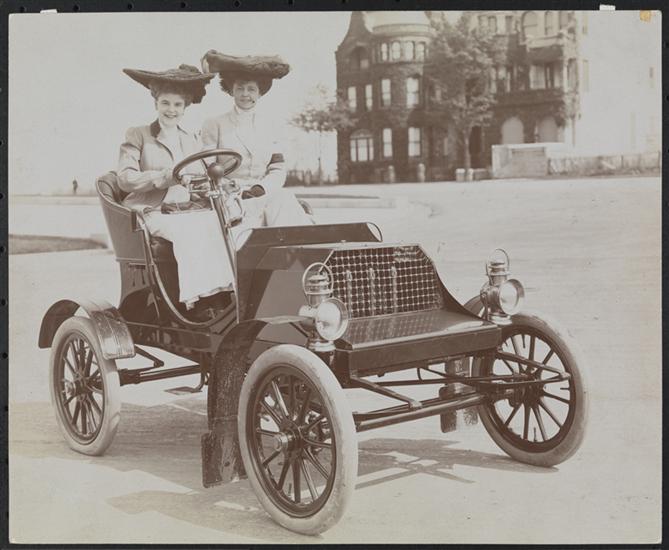 Two women seated in a 1902 Franklin roadster on Riverside Drive; large house visible beyond.