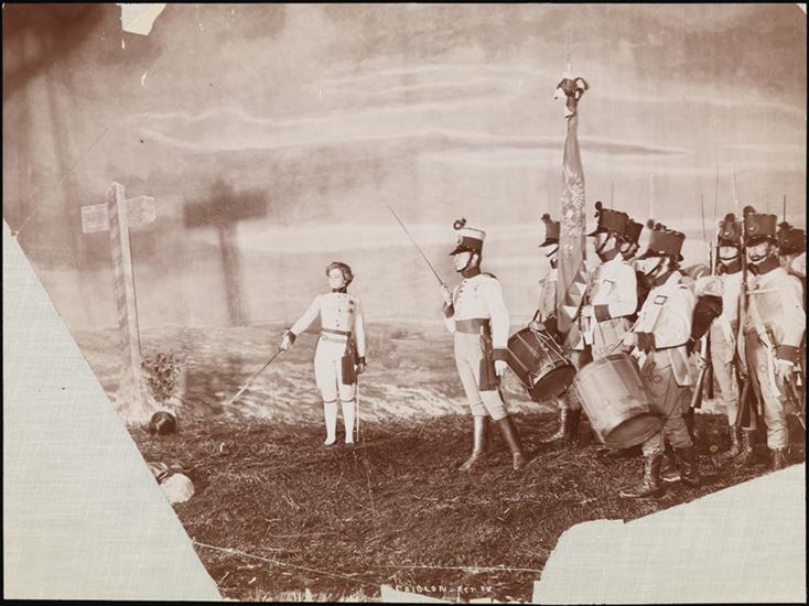 A scene in Act IV of Charles Frohman's production of "L'Aiglon" by Edmond Rostrand, featuring Maude Adams as the Duke of Reichstadt, presented at the Knickerbocker Theatre, New York City, 1900. The production was directed by Joseph Humphreys; costumes designed by Dazian.