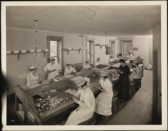 Workers in the face powder box manufacturing department of the Crystal Chemical Co. at 134th Street & Willis Avenue.