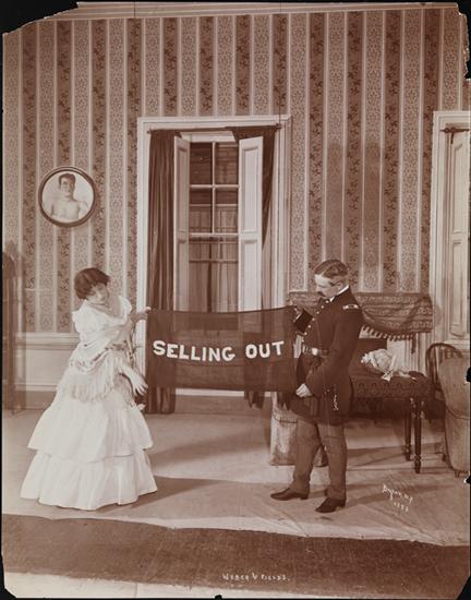 A scene from the Weber & Fields' burlesque of the romantic drama by Cylde Fitch, "Barbara Frietchie." The burlesque, titled "Barbara Fidgety," had book by Edgar Smith, lyrics by Harry B. Smith, music by John Stromberg and featured Mabel Fenton as Barbara Fidgety, and Charles Ross as Captain Grumble.