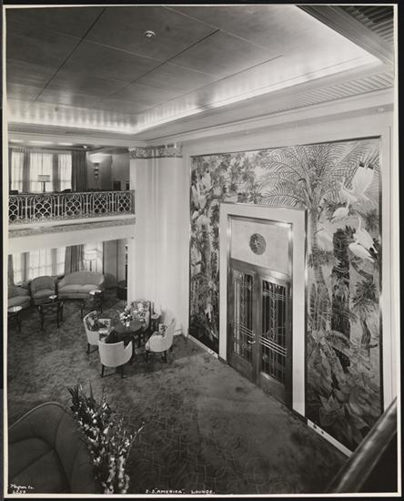S.S. "America" at Newport News Shipyard, VA, Cabin Class, Interior, Lounge, from Mezzanine.