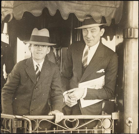[Mayor Jimmy Walker and other men being followed by a crowd in Venice.]