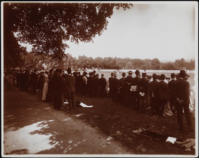 A crowd watching a military line-up of cadets at West Point Military Academy.