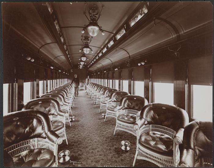 Pullman car on an Erie Railroad Co. train, wicker chairs, spittoons and porter.