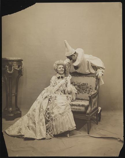 Portrait of an unidentified woman and a man in a clown costume at the James Hazen Hyde Ball, January 31, 1905.