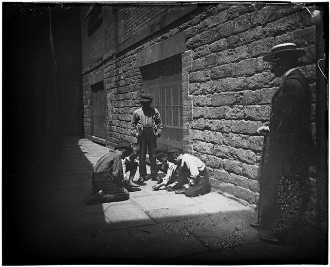 "Shooting craps" in the hall of the Newsboys' Lodging House.