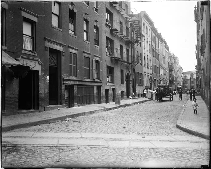 [Unidentified street scene, row of clapboard buildings with businesses on the ground floor]