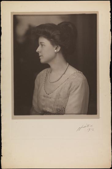 [Unidentified woman in profile, with pearl earrings and décolleté dress]