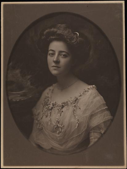 [Oval portrait of an unidentified woman in a pearl necklace and décolleté dress]