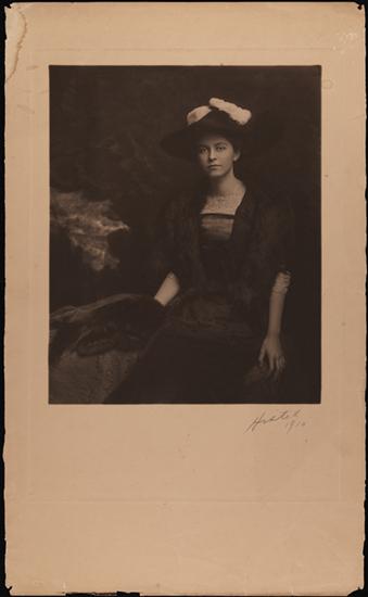 [Unidentified woman with high-necked blouse and large hat.]