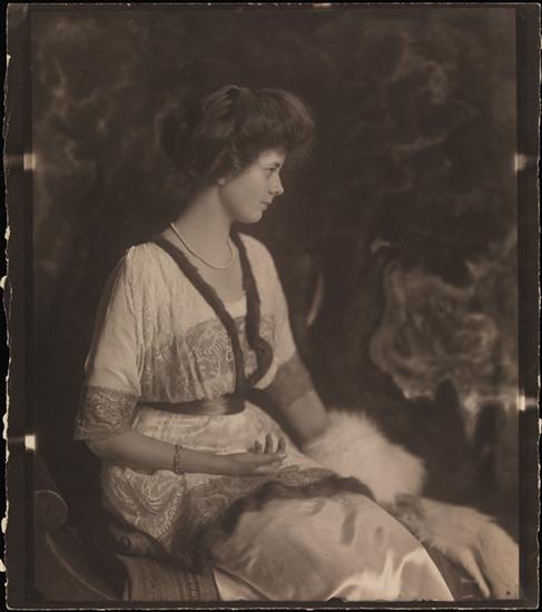 [Unidentified woman in satin dress wearing gloves, a choker, and large hat, with landscape backdrop]