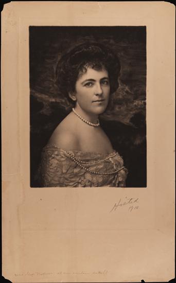 [Unidentified woman in black dress with pearl necklace and earrings, landscape backdrop]